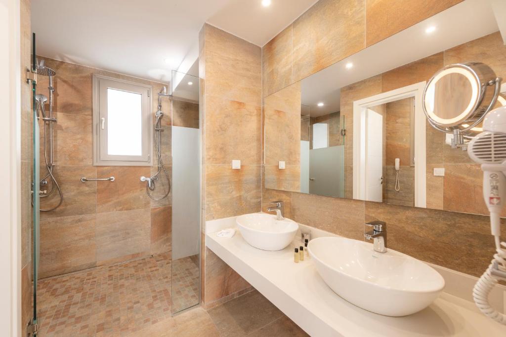 De suites zijn elegant en modern ingericht met hoogwaardige voorzieningen zoals airconditioning, gratis Wi‑Fi, minibar, kluisje en vaak een zithoek voor extra comfort. Er zijn verschillende suite‑typen beschikbaar, waaronder junior suites met zeezicht en jacuzzi op het balkon, suites met toegang tot een zwembad en ruime spa suites met extra binnen‑wellnessfaciliteiten. Veel accommodaties hebben een balkon of terras waar je kunt genieten van het uitzicht op de Aegeïsche Zee en de zonsondergang. De badkamers zijn luxe uitgerust met douche en vaak extra wellness‑elementen, en de lichte, minimalistische inrichting draagt bij aan een ontspannen verblijf.