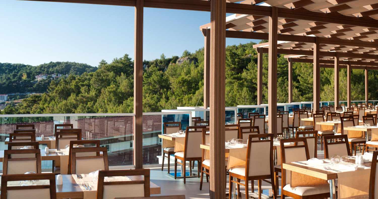 Het hotel ligt op een heuvel waardoor je vanuit delen van het complex een schitterend panoramisch uitzicht hebt over de omgeving en de zee, terwijl het openbare strand en het centrum van Ölüdeniz met winkels, cafés en restaurants op korte afstand zijn.